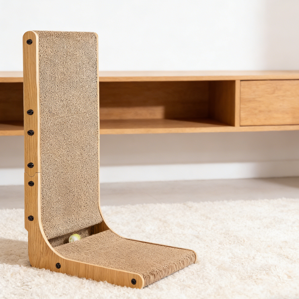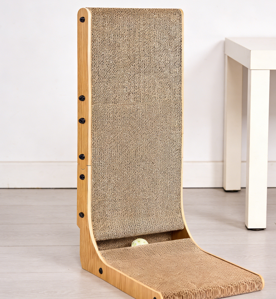 This L-shaped scratching board features a vertical surface designed for scratching activity and includes a small ball toy for interaction.