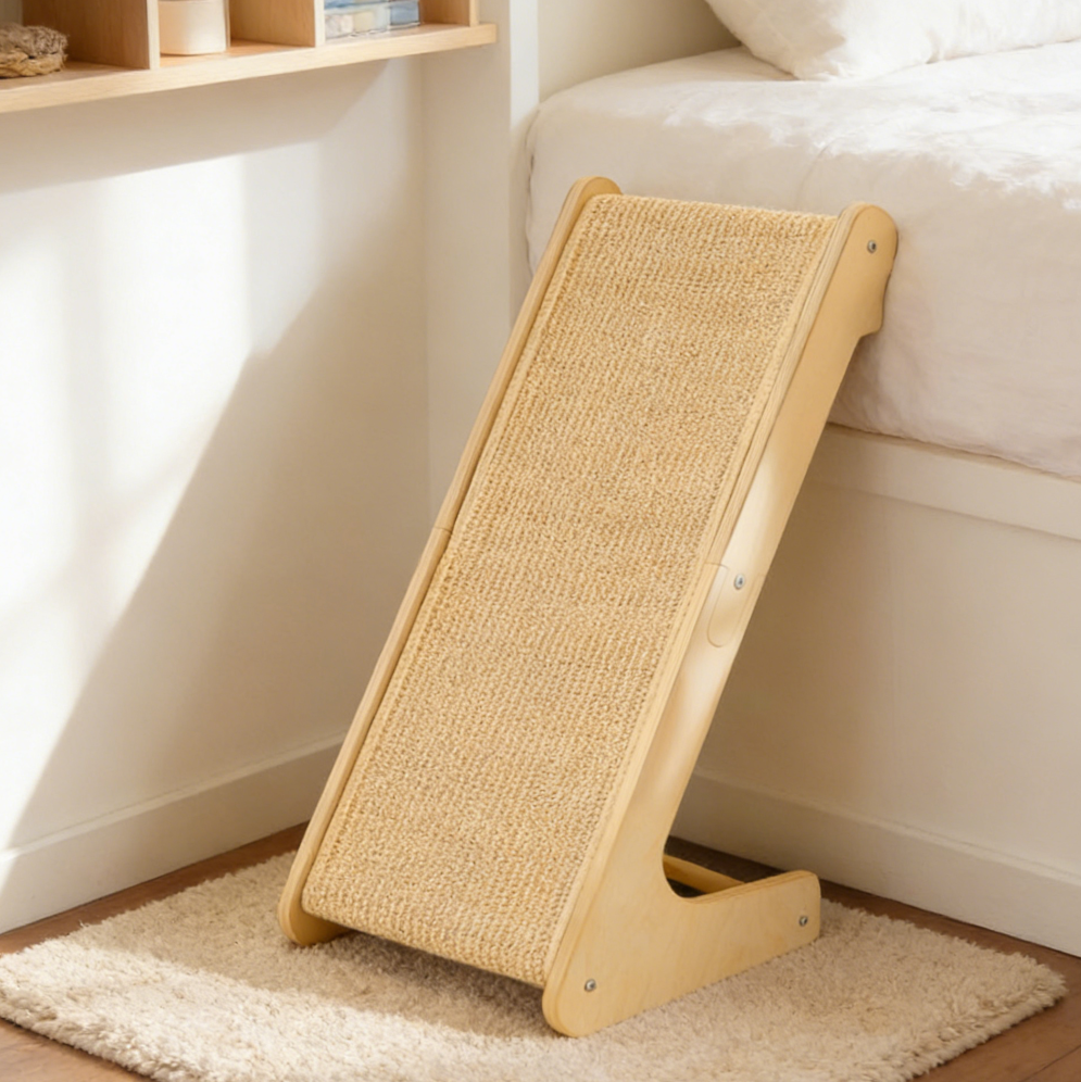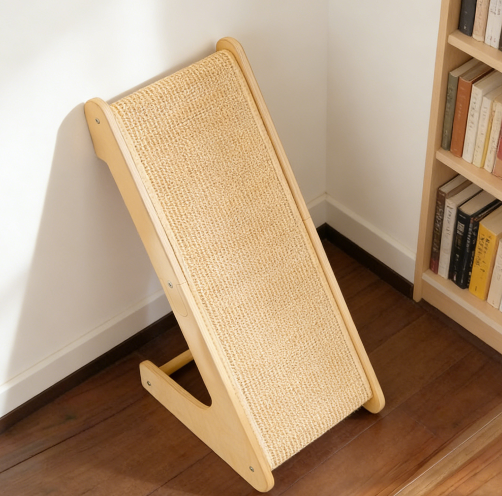 This scratching board features an L-shaped ramp structure wrapped in sisal material. The angled design provides a scratching surface suitable for different scratching positions.
