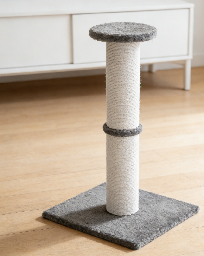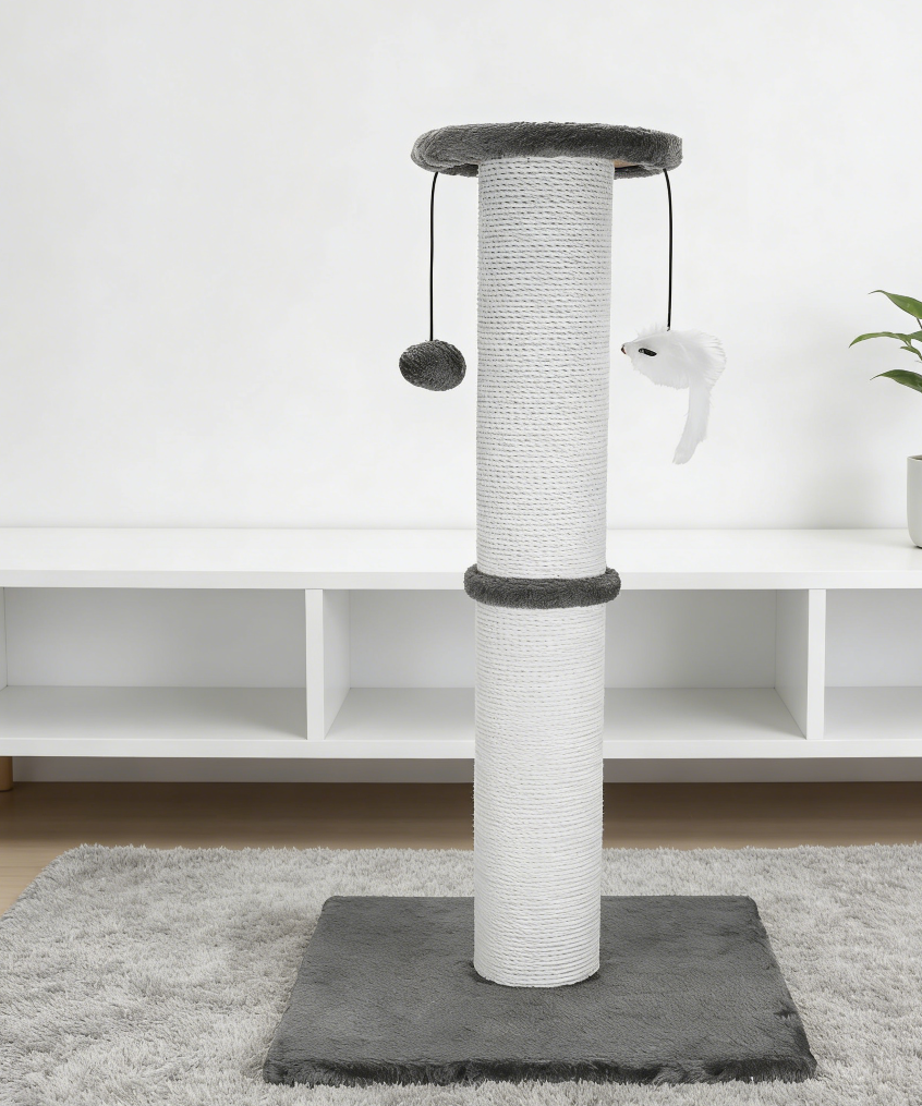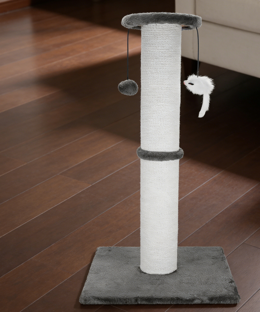This cat scratching post features a cotton rope wrapped column and a sturdy base. Hanging toys add an interactive element for play.