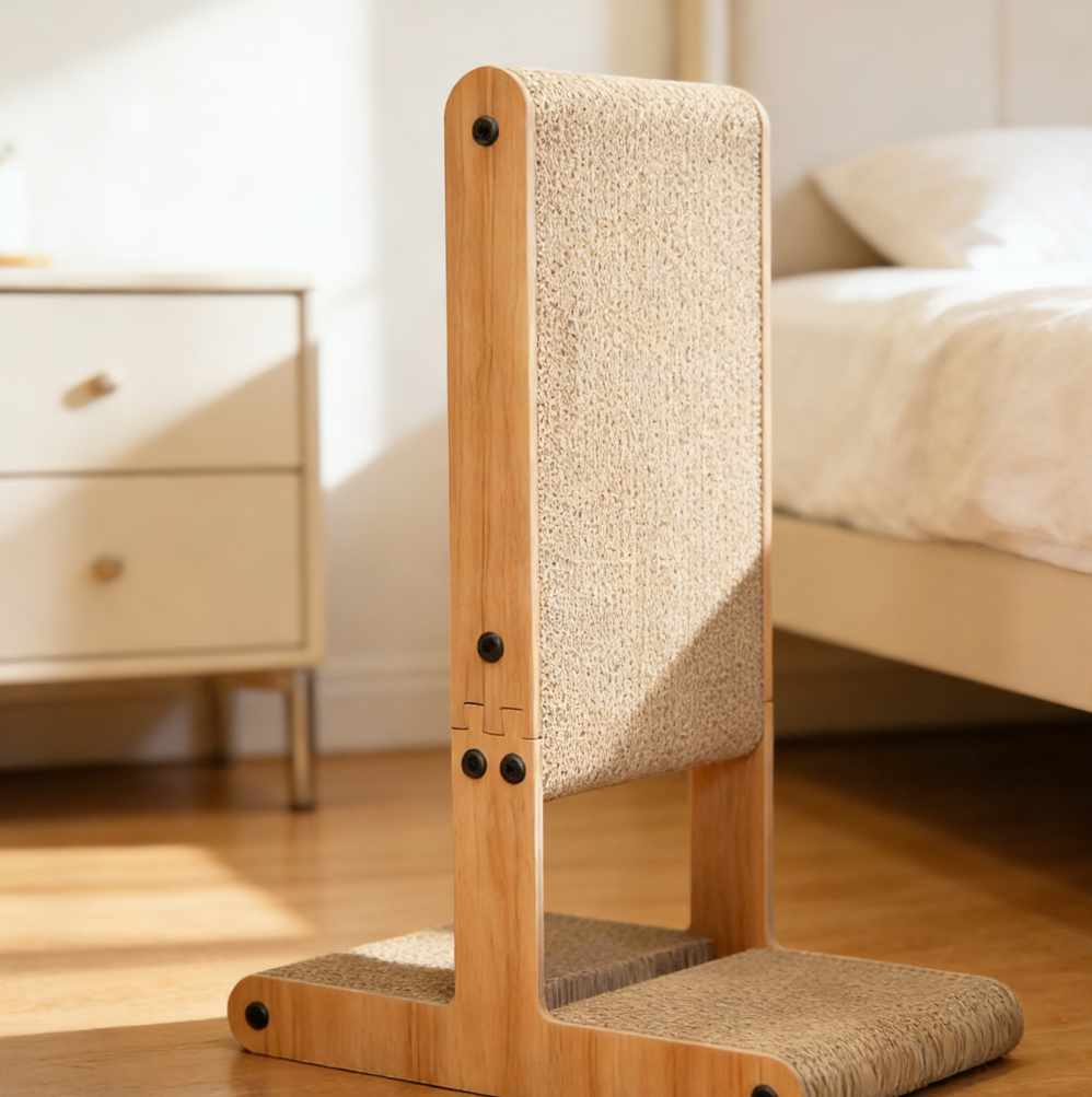 This scratching board features a T-shaped structure with double-sided cardboard surfaces and a rolling ball toy for interactive play.